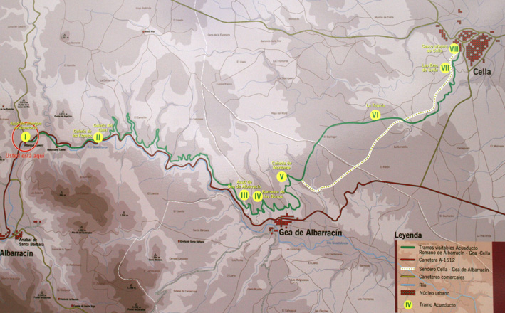 Plano del recorrido del acueducto romano de Albarrcín-Cella y los puntos de interés visitables. (Foto: Roberto Lérida Lafarga 23/04/2008) |