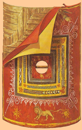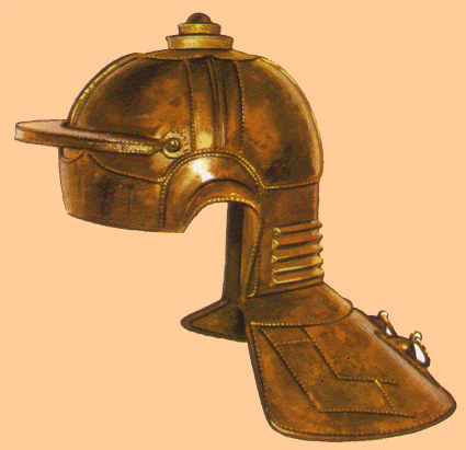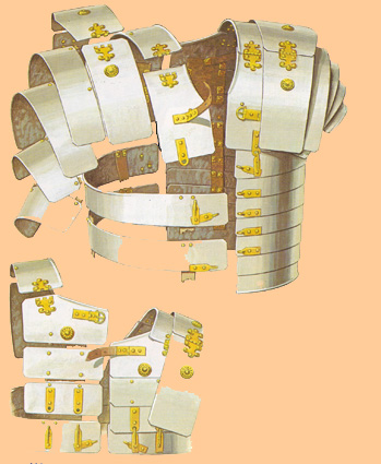 En época imperial las corazas evolucionaron considerablemente, pasando de las antiguas de bronce y cuero que se ceñían al tórax –y que en el imperio seguían usando los oficiales superiores- a una nuevas, las loricae squamatae, hechas con láminas metálicas superpuestas a modo de escamas. Los escudos circulares y ovales fueron sustituidos en la legión por escudos rectangulares. Estos escudos se hacían con madera recubierta de cuero o de láminas metálicas y en el centro de colocaban unas piezas metálicas de refuerzo para absorber la fuerza de los golpes, al tiempo que por dentro servían para fijar el asa por donde se sujetaba el escudo. |