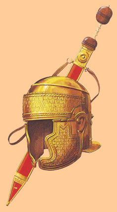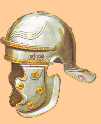 Posteriormente, todavía en la República, el estado, que construyó talleres públicos de armas, dotó a soldados y oficiales con el sagum –casaca abierta que se abrochaba con corchetes-, caligae –el calzado semejante a botas de cuero con aberturas- y cassis –casco-. En su cinturón, en ocasiones profusamente decorado con placas metálicas, llevaban una daga y la espada -gladius-. |