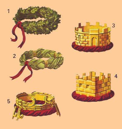 1.- Corona civica. 2.- Corona obsidionalis. 3.- Corona muralis. 4.- Corona vallaris 5.- Corona navalis. |