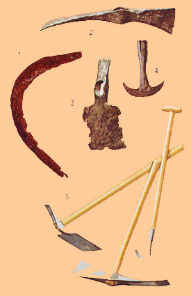 1. Hoz. 2. Pico. 3. Pala o azadón. 4 Cortacésped. 5. Reconstrucción de herramientas para cavar |