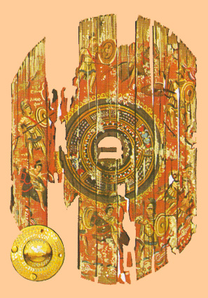 Scutum rectangular de época imperial: a la izquierda se pueden observar sus capas de madera y cuero; en el centro, su interior con sus sistema de agarre y a la derecha la placa metálica que cubría el centro del escudo. De manera general los escudos eran decorados incluso en vivos colores con figuras geométricas, figuras humanas y animales, etc. |