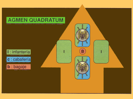 If the army crossed a hostile territory, it used to adopt a defensive square-shaped formation –agmen quadratum-, with the impedimenta in the centre, the min body of the infantry flanking the impedimenta and the vanguard and the rear with the same troops than the ordo agminis. |