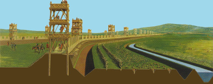 Reconstrucción de la doble circunvalación de los romanos en Alesia (hoy Alise-Sainte-Reine, Francia) con diferentes medidas defensivas. |