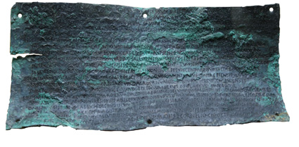 "Let those of the Senate of Contrebia who shall be present at the time be judges. If it appears, with regard to the land that the Salluienses purchased from the Sosinestani for the purpose of making a canal or chanelling water, which matter is the subject of the dispute, that the Sosinestani were within their rights to sell it, although the Allavonenses were unwilling, then, if it so appears, let the judges judge with regard to the land which is the subject of the dispute that the Sosinestani were within their rights to sell it to the Salluienses; if it does not so appear, let them judge that they were not within their rights to have sold it. Let the same persons who are written above be judges. On the assumption that <there is, in fact, a Sosinestan civitas>, then, in the place where the Salluienses recently and officially put in stakes, which matter is the subject of this action, if it would be permissable for the Salluienses within their rights to lead a canal within those stakes through the public land of the Sosinestani; or if it would be permissable for the Salluienses within their rights to make a canal through the private land of the Sosinestani, in the place where a canal ought to be made, so long as the Salluienses pay the sum for which the land would be assessed, where the canal would be led; then, if it so appears, let the judges judge that it is permissable for the Salluienses within their rights to make the canal; if it does not so appear, let them judge that it is not permissible for them within their rights so to do. If they judge that it is permissible for the Salluienses to make the canal, then let the Salluienses pay from public funds money for the private lands where the canal shall be led, on the arbitration of five men whom a magistrate of Contrebia shall appoint from his/their Senate. Gaius Valerius Flaccus, son of Gaius, imperator, assigned jurisdiction. They pronounced the opinion: Whereas right of judgement is ours, in the matter that is under dispute we judge in favor of the Salluienses. When this matter was decided, these were the Contrebiensen magistrates: Lubbus of the Urdini, son of Letondo, praetor; Lesso of the Sirisces, son of Lubbus, praetor; Babbus of the Bolgondisces, son of Ablo, magistrate; Segilus of the Anni, son of Lubbus, magistrate; ..... of [-- ]uvolices, son of Uxe[---], magistrate; Ablo of the Tindilices, son of Lubbus, magistrate. The case for the Sallui[enses] was presented by [---]assius, son of Eihar, a Salluiensian. The case for the Allavonenses was presented by Turibas, son of Teitabas, [an Allavonensian. Trans]acted at Contrebia Balaisca on the ides of May, in the year when L. Cornelius and Gnaeus Octavius were consuls (87 B.C.E.)". |