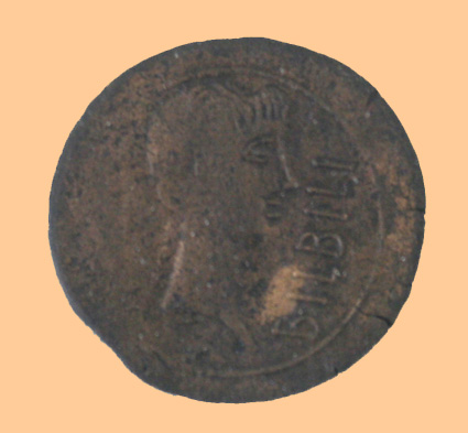 Monedas de Bilbilis de época romana, la de la izquierda con un busto quizás de un emperador y la de la derecha con la laurea. Museo de Calatayud. (Fotos: Roberto Lérida Lafarga 16/03/2008) |