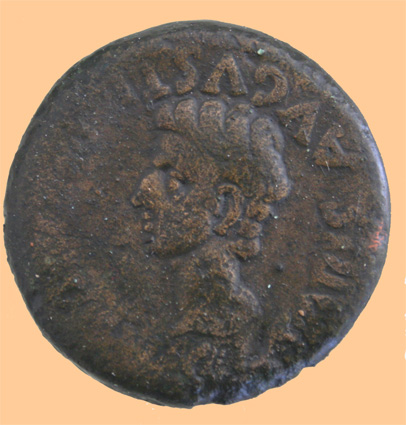 Monedas de Bilbilis de época romana, la de la izquierda con un busto quizás del emperador Augusto o Tiberio y la de la derecha con la laurea. Museo de Calatayud. (Fotos: Roberto Lérida Lafarga 16/03/2008) |
