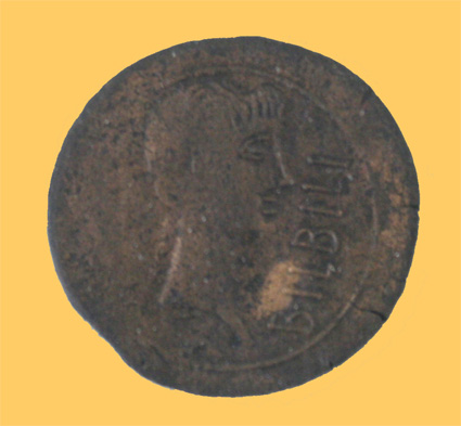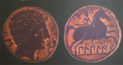 Coins form Bilbilis dated in the Roman age; on the left. coin probably with the bust of an emperor, and on the right coin with the laurea. Museum of Calatayud. (Photos: Roberto Lérida Lafarga 16/03/2008) |