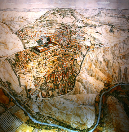 One of the building problems that had Bilbilis was the orography; the hill and the hillsides were not, a priori, a place very adequate to construct a city. However, thanks to the knowledge of the Roman engineers and architects the problem was pragmatically resolved. The public and private buildings are supported by terraces that cut in a series of steps the terrain. The communications and the public roads were resolved with steep streets, outside staircases or ramps there where it was necessary. So, Bilbilis was not planned as the typical Roman cities from a system of streets perpendicular and parallel to two main axes (the cardo –from north to south- and the decumanus –from east to west-), but it has a picturesque structure and planning. Nevertheless, all the elements of a Roman city were present at the city: cleverly distributed spaces, public services like the supply of water and the sewers, walls, public squares, fountains, public and private buildings, thermae and theatre. No doubt, Bilbilis, a mix of indigenous –the setting- and Roman –the planning and the urban development- characteristics, was developed as a city that reflected the spirit of its citizens anxious for being Romans. |