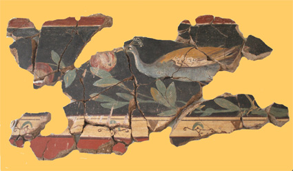 Fresco of the peacock, from the room 29 of the domus 3 of the insula I in Bilbilis, dated in the first half of the I century a. C. Museum of Calatayud. (Photo: Roberto Lérida Lafarga 16/03/2008) |