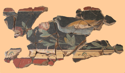 Fresco del pavo real, procedente de la estancia 29 de la domus 3 de la insula I de Bilbilis, fechado en la primera mitad del siglo I d. C. (Foto: Roberto Lérida Lafarga 16/03/2008) |