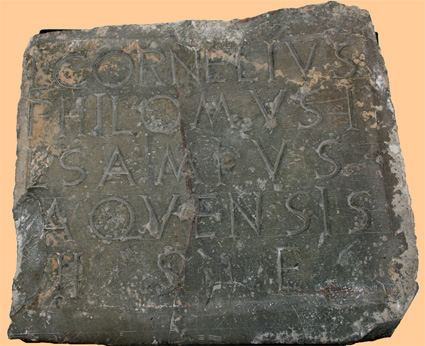 Inscripción de L. Cornelius Samius. (Foto: Roberto Lérida Lafarga 16/03/2008) El texto latino de la inscripción dice: L(UCIUS) CORNELIUS PHOLUMUSI L(IBERTUS) SAMIUS AQUENSIS H(IC) S(ITUS) E(ST); su traducción sería: "Lucio Cornelio Samio, liberto de Filomuso, acuense -es decir, de Aquae Bilbilitanorum, la actual Alhama de Aragón-, aquí está enterrado". |