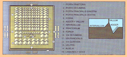 Esquema de un campamento, procedente de VIÑAS, Antonio et alii, Latín, Valencia, 1997 |