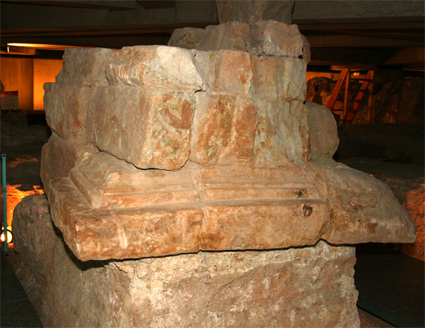 Cimientos y base de un pilar del foro con molduras y sillares de piedra. (Foto: Roberto Lérida Lafarga 28/04/2008) |