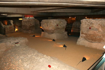 Detalle de las dos cloacas paralelas en el Museo del Foro de Cesaraugusta. (Foto: Roberto Lérida Lafarga 28/04/2008) |