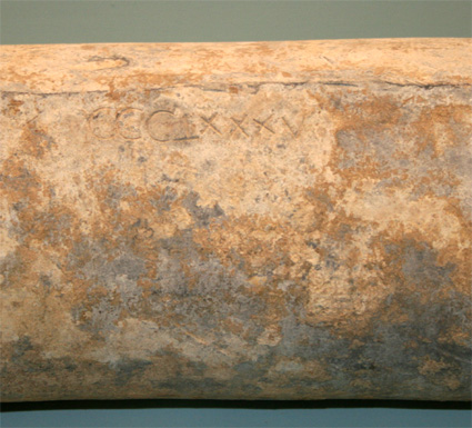 Detalle de una tubería de plomo del puente-acueducto de Caesar Augusta con inscripción numérica: CCCLXXXV. (Foto: Roberto Lérida Lafarga 28/04/2008)