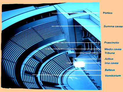 Entre los anillos y muros de cemento se levantó una red de galerías, dos pasillos grandes y circulares, el pórtico, más externo, y la crypta, más interno, y escaleras con vomitoria que permitían el acceso a la cavea. El graderío se organizaría en tres partes: la ima cavea –graderío inferior, para las gentes acomodadas, invitados oficiales, etc.- que estaba separada de la orchestra por un pequeño murete o pretil –balteus- y un pequeño pasillo –praecinctio- donde los primeros asientos –proedria- estaban decorados con molduras; sobre la ima cavea estaría la media cavea –graderío medio- al que se accedería a través de los vomitoria y por encima de éste la summa cavea –graderío superior- a la que se accedía por pasillos y escaleras, si bien no se ha conservado nada de la misma.