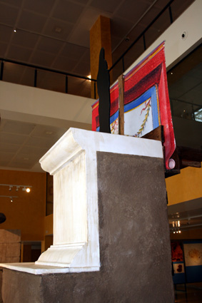 A la izquierda, detalle de la reconstrucción en maqueta del sistema de elevación del aulaeum del teatro de Caesar Augusta, según los paneles informativos del Museo del Teatro de Caesaraugusta. A la derecha, reconstrucción de pulpitum y aulaeum. (Fotos: Roberto Lérida Lafarga 28/04/2008) |