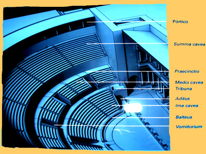 Between the rings and the walls made of mortar it was erected a system of galleries, two large and circular aisles -a porch, the outer, and a crypta, the inner- and stairs with vomitoria that allowed to access to the cavea. The rows of seats ware organized in three parts: the ima cavea –lower rows of seats, to the rich people, official guest, etc.- that was separated from the orchestra by a small parapet –balteus- and a small aisle –praecinctio- were the firs seats –proedria- were decorated with mouldings; over the ima cavea it was the media cavea –middle rows of seats- to which it was possible to access through the vomitoria; and over this it was the summa cavea –higher rows of seats- to which it was possible to access by aisles and stairs, although nothing of it has been preserved.