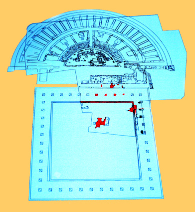 The first work necessary to the building of the theatre was the terraces in the terrain to obtain a regular surface suitable to this building, i. e., a levelling of the terrain due to the unevenness that existed in this part of the city between the different layers of natural gravels. So, the theatre occupied the highest point of the city, looking down on an axe that came from the theatre and arrived to the river port, crossing the thermae and the forum. |