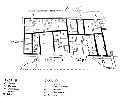 La Casa de la Tortuga Es una vivienda edificada entorno a un atrio cubierto –testudinado-, alrededor del cual se encuentran los dormitorios –cubicula- y un gran tablinum; un amplio vestibulum daría acceso al triclinium y a una zona enlosada; una escalera permitía el acceso a un piso superior y al sur de la domus había un huerto. En esta domus se han localizado pavimentos en mortero blanco en el vestibululm, atrium y tablinum, mientras que en otras estancias había suelos de tierra o gravilla muy fina; en la entrada de la casa se puede leer un pequeño mosaico con teselas sobre opus signinum donde se lee CAVE CANE (“cuidado con el perro”). |