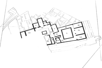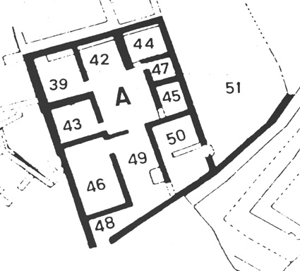 Planta de la Casa de los Delfines procedente de BELTRÁN LLORIS, Miguel: Celsa, (Colección Guías Arqueológicas de Aragón 2), Zaragoza, 1991 |