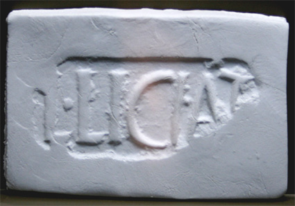 Sello en alabastro donde se lee L.LICI.AT, es decir, L(ucius) Lici(nius) At(ticus), nombre del posible dueño de la Casa de los Delfines en el Museo de Celsa (Museo Provincial de Zaragoza). (Foto: Roberto Lérida Lafarga 21/06/2008) |