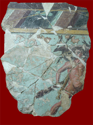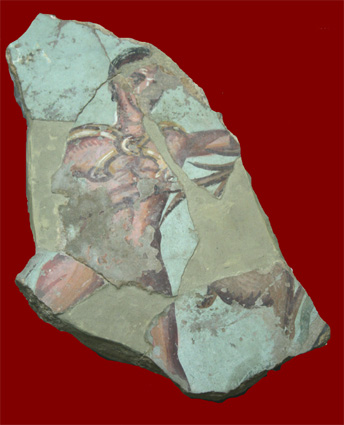 Fragmento de uno de los frescos del triclinium de la Casa de Hércules con escenas del héroe, expuesto en el Museo de Celsa (Museo Provincial de Zaragoza). (Foto: Roberto Lérida Lafarga 21/06/2008) |