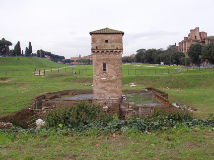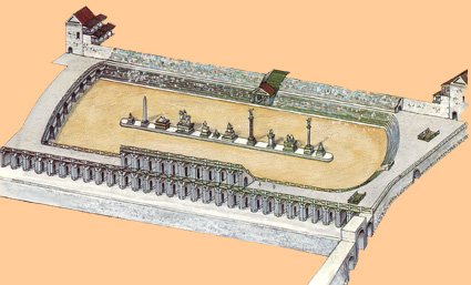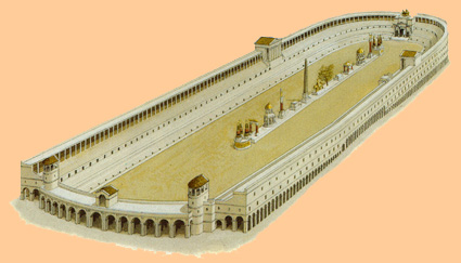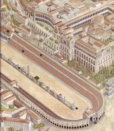 El más antiguo y de mayores proporciones era el Circo Máximo, construido sobre la depresión del valle de Murtia, entre las colinas del Palatino al norte y del Aventino al sur. Se sabe que ya en los siglos VII y VI a. C. este pequeño valle fue acondicionado y drenado para la celebración de carreras de caballos, colocando unas gradas de madera –fori publici-. En mitad del circo había dos columnas cónicas de madera que señalaban las líneas de salida y de llegada de la carrera –metae- que era donde los carros tenian que girar; frente a la meta occidental se construyeron en el 329 a. C. unos cobertizos y caballerizas –carceres, literalmente “cárceles”- donde permanecían los caballos y desde donde salían a la carrera y la Porta Pompae, la puerta principal de acceso al circo. Posteriormente las dos metae fueron unidas por un zócalo longitudinal, tras el drenaje de la depresión del valle de Murtia. El zócalo –llamado spina porque semejaba una columna vertebral- fue decorado con estatuas de divinidades; en el 189 a. C. se añadieron los Septem Ova, grandes figuras de madera en forma de huevo que se iban retirando según se completaba cada una de las siete vueltas de las que constaba cada carrera. |