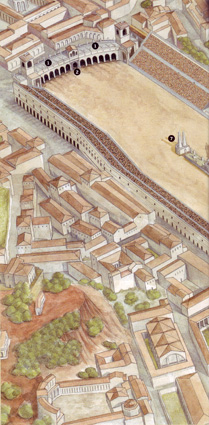 Reconstrucción del Circo Máximo procedente de BAENA DE ALCÁZAR, Luis: “El Circo Máximo”, Historia National Geographic, 38 (2007), Barcelona. Arriba a la izquierda se observan las carceres (1) y la Porta Pompae (2); a su derecha el pulvinar (3) bajo los palacios imperiales y las gradas -caveae- inferior(4) y superior (5); en el centro del circo la spina (6) con las metae en sus extremos (7); por último, la Puerta Triunfal (8). |