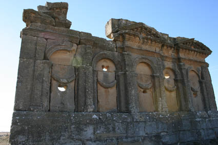 Sádaba: Mausoleo de los Atilios: Una vez llegados a Sádaba se toma la carretera a Uncastillo (A-1202) y a nos 2 o 2,5 kms. a la izquierda de la carretera hay un señal que indica Embalse de Valdelafuen por un camino no asfaltado. Hay que tomar este desvío y a menos de 1 km. se llega al Mausoleo que es visible desde la carretera. |