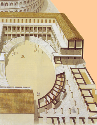 Reconstrucción del Ludus Magnus, procedente de CONNOLLY, Peter y DODGE, Hazel: La Ciudad Antigua. La vida en la Atenas y Roma clásicas, Madrid, 1998. |