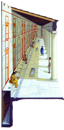 Hypothetical reconstruction of latrines in Rome, maybe to 100 people, in the present Largo Argentina (according to CONNOLLY, P. y DODGE, H., La Ciudad Antigua. La vida en la Atenas y Roma clásicas, Madrid, 1998) |