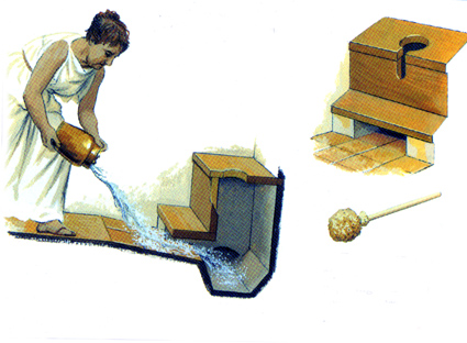 Latrine in a private house with the small brush with sponge (according to CONNOLLY, P. y DODGE, H., La Ciudad Antigua. La vida en la Atenas y Roma clásicas, Madrid, 1998) |