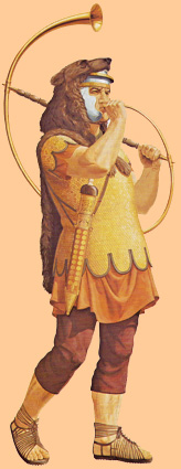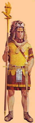 El nombre que recibió en un principio el ejército reclutado es legión –en latín legio, del verbo legere, “elegir”-. Esta legión venía a estar compuesta por los contingentes proporcionados por las tribus y las curias romanas. La legión era la infantería pesada del ejército romano. Roma estaba dividida en tres tribus (Ramnes, Tites y Luceres) y cada tribu en diez curias; cada curia proporcionaba 10 caballeros (decuria) y 100 infantes (centuria), de manera que el primitivo ejército romano estaba compuesto de 300 soldados de caballería (celeres) y 3.000 de infantería (milites). Durante la Monarquía la caballería constituía más bien la guardia personal del rey y combatían en muchas ocasiones a pie, mientras que la infantería combatía un tanto caóticamente sin apenas orden de batalla. |
