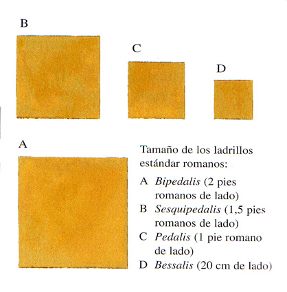 Cuando los recursos económicos eran menores o el edificio era particular se recurría a materiales más baratos, como el opus craticum –un armazón de madera relleno de piedra de machaqueo y mortero-; los ladrillos también eran frecuentes en las construcciones romanas, con sus diversas tipologías: bipedalis –de dos pies de largo, 59 cms.-, sesquipedalis –de un pie y medio de largo, 44 cms.-, pedalis –de un pie de largo, 29,5 cms- y bessalis –de 20cms. de lado-.