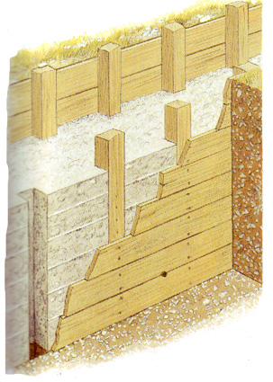 Armazón del opus caementicium. Reconstrucción procedente de CONNOLLY, Peter y DODGE, Hazel: La Ciudad Antigua. La vida en la Atenas y Roma clásicas, Madrid, 1998. |