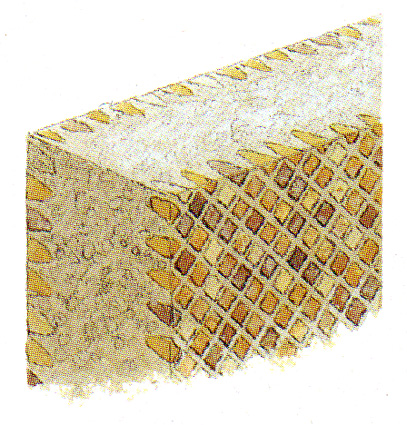 Opus reticulatum. Reconstrucción procedente de CONNOLLY, Peter y DODGE, Hazel: La Ciudad Antigua. La vida en la Atenas y Roma clásicas, Madrid, 1998. |