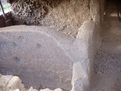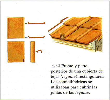 Los techos se hacían de madera y se cubrían con tejas planas rectangulares de terracota –tegulae- generalmente de unos 45 x 60 cms.; las tejas eran unidas por otra teja semicilíndrica –imbrex- para evitar filtraciones de agua; decorativamente, la unión de las tegulae y los imbrices eran tapados por tejas llamadas antefixi, que representaban cabezas humanas, animales, etc. |
