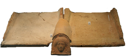 Tejas planas –tegulae- procedentes de Caesar Augusta (s. I d. C.), teja curva –imbrex- (s. I d. C.) procedente de la Colonia Celsa (Velilla de Ebro, Zaragoza) y antefija –antefixus- (s. I d. C.) procedente de El Convento (Mallén, Zaragoza). Museo Provincial de Zaragoza. (Foto: Roberto Lérida Lafarga 3/1/2008) |