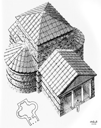 Planta y restitución gráfica en perspectiva del estado original del Mausoleo de la Sinagoga de Sádaba, según GARCÍA Y BELLIDO, A.: “La villa y el mausoleo romanos de Sádaba”, Archivo Español de Arqueología 36 (1963), pp. 166-170 |