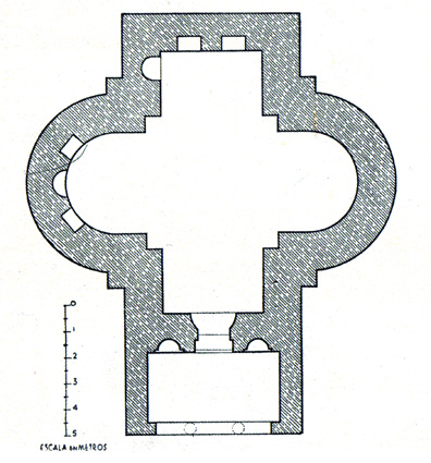 Arquitectónicamente tiene planta de cruz con brazos igual con un espacio cuadrangular central de 5 metros de lado que forma el crucero elevado sobre el resto de la construcción. Por el grosor de los muros -1,5 metros en todo el perímetro, salvo en el vestíbulo- se supone que la techumbre era abovedada: los brazos norte y sur con bóveda de medio cañón y los brazos este y oeste con bóveda de un cuarto de esfera; el crucero podría coronarse con una cúpula o con una bóveda de arista, aunque no hay evidencias de ello.