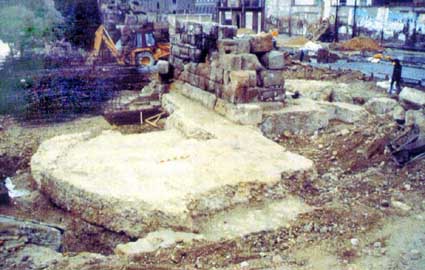 Basamento de cubo de la muralla junto al Mercado Central (Foto procedente de BELTRÁN LLORIS, Miguel y FATÁS CABEZA, Guillermo: Historia de Zaragoza 2: César Augusta, ciudad romana, Zaragoza, 1998) |
