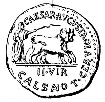 La forma de fundación recibe el nombre de deductio, es decir, etimológicamente “llevar algo de un lugar a otro”, en la práctica “trasplantar un pedazo de Roma en un suelo nuevo”. Para que la deductio fuera efectiva era necesario “fundar una nueva Roma”, es decir, seguir el rito fundacional de origen etrusco que Rómulo utilizó para la fundación de Roma: un sacerdote uncía una pareja de bueyes y trazaba con un arado ritual con la reja de bronce el perímetro de la ciudad y de su muralla, rompiendo así el suelo de la madre Tierra; de esta manera el recinto resultaba consagrado, protegido por los dioses romanos y en su interior no podía matar a nadie, enterrar cadáveres, aportar tropas, etc. En el trazado del perímetro, el sacerdote levantaba el arado del suelo cuatro veces, en los cuatro puntos cardinales donde se colocarían respectivamente cuatro puertas de acceso a la ciudad. Esta fundación ritual quedó reflejada en monedas acuñadas en Caesar Augusta. |
