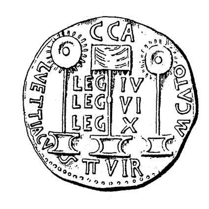 Dupodio de época de Tiberio (31-32 d. C.) con las insignias y la mención de las legiones de las que procedían los veteranos que fundaron Caesar Augusta, según DELGADO, A., Nuevo método de clasificación de las medallas autónomas de España, Sevilla, 1871-1876. (Foto procedente de BELTRÁN LLORIS, Miguel y FATÁS CABEZA, Guillermo: Historia de Zaragoza 2: César Augusta, ciudad romana, Zaragoza, 1998) |