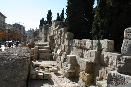 En cuanto a la construcción de la muralla hay que decir que ésta se adaptó al desnivel de la ciudad, como lo manifiestan los restos aparecidos en la zona noreste de la misma. La técnica de construcción de la muralla fue uniforme: en el centro opus caementicium, es decir, hormigón formado por la mezcla de agua, arena y cantos rodados (en ocasiones alcanza un espesor de 4 metros), mientras que en el exterior se utilizaron sillares de gran tamaño para dar fortaleza a la muralla; en algunas zonas la muralla estaba cimentada por un cubo, como en la zona del Torreón de la Zuda, donde el basamento alcanza casi los 11 metros de diámetro con un gran peralte. La muralla se inició en época del propio Octavio Augusto y, sin duda, hacia finales del siglo I a. C. ya debía de estar finalizada, suponiendo una evidente y manifiesta prueba del rango y del prestigio de la colonia. De esta primera época datan el torreón del Paseo Echegaray 154-156, la puerta decumana Oeste, los restos del Coso 7 y 13 y el área del Torreón de la Zuda. |