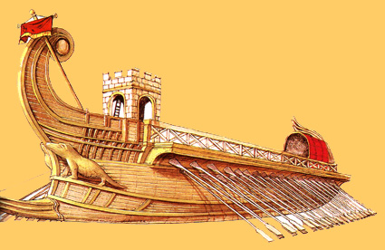 In spite of the fact that Rome is not far away from the sea and in its expansion along Italy, Europe, Asia and Africa it enclosed a complete sea –the Mare Nostrum, as they called it-, the Romans kept as a terrestrial army with a projection to the continent; although they resorted to build and maintain a war fleet, this fact did not suppose any advance in relation to the Greek, Hellenistic and Carthaginian fleets, nor a progress in the art of navigation and the naval wars; in a way, the fleet and the navy were a charge for the Romans. Probably, one of the reasons was the fact that the naval battles were in fact terrestrial battles on the ship decks and only the manoeuvres to sink and not to be sunk, crashing the bows reinforced with metallic spurs, made the difference between the naval and the terrestrial wars. |