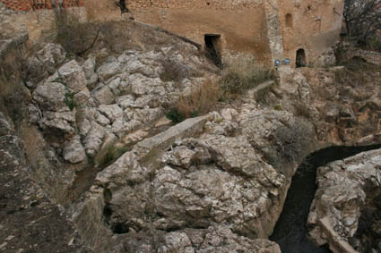 Se han observado restos de dos canales (rivi) de derivación inmediata; uno puede responder a un primer aliviadero ocultado después; pero del segundo se conservan dos tramos sobre las calizas naturales que debían alimentar las tierras de regadío de Belchite -más de 6.000 hectáreas- y quizás aguas urbanas para el castellum y las termas de la ciudad de nombre desconocido del Cabezo de Nuestra Señora del Pueyo de Belchite. De hecho la “acequia madre de Belchite”, entre esta localidad y Almonacid de la Cuba, es el canal originario romano, riega actualmente estas tierras, llegando hasta el cerro de la ciudad romana desconocida, y ha tenido un mantenimiento hasta la actualidad. En el cercano barranco de Barcalien hay restos de un acueducto original romano con unos tramos en roca natural de entre 0,65 y 0,75 metros de anchura y otros tramos con galería cubierta con bóveda de medio arco; las avenidas de agua por la barranquera han destruido seriamente esta galería cubierta. El acueducto continuaría por el Tercón hasta Belchite Viejo, por la acequia de la Playa, en zona de gravas naturales, hasta los campos inferiores de Nuestra Señora del Pueyo, salvando el Barranco de las Viñas con pilares pétreos no conservados y con specus (canal sobre un acueducto) de caliza fosilífera. |
