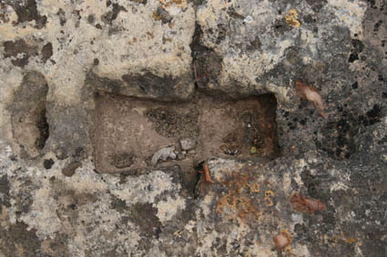 Hueco de una de las grapas metálicas utilizadas para unir los grandes sillares en opus quadratum de la presa (Foto: Roberto Lérida Lafarga 19/11/2007) |