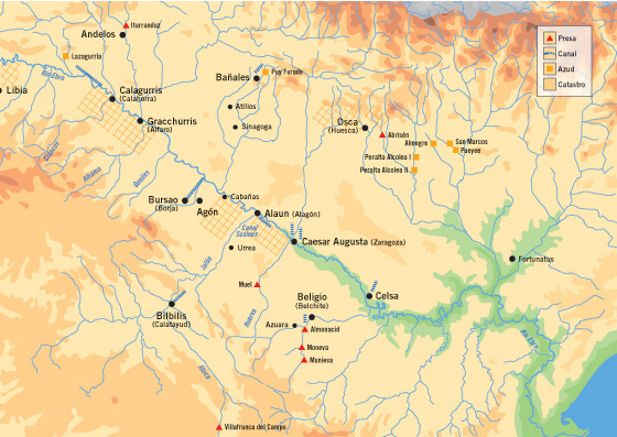Recursos hidráulicos romanos en el valle del Ebro, según BELTRÁN LLORIS, Miguel: “El agua profana en la cuenca media del valle del Ebro: AQUA DUCTA. La captación del agua, presas, embalses, conducciones”, en AA. VV.: Aquaria: Agua, territorio y paisaje en Aragón, Zaragoza, 2006 |